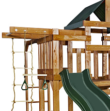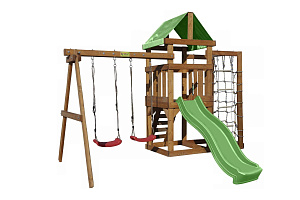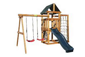 Комплекс включает в себя: веревочные качели (2 шт), двухместные качели и горку.