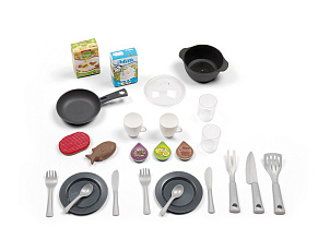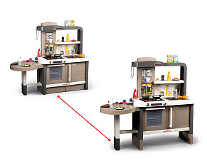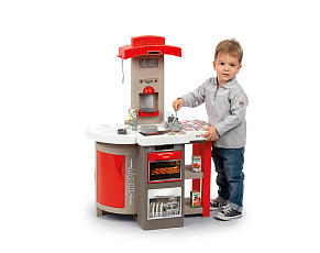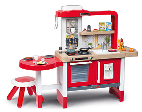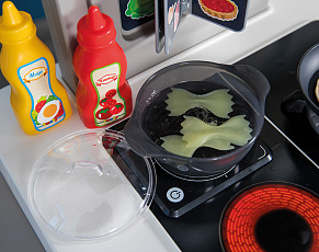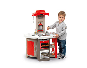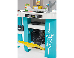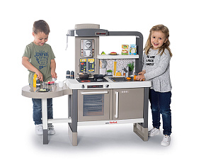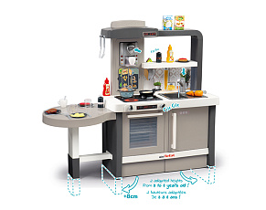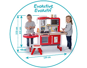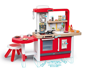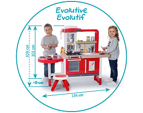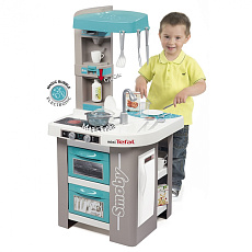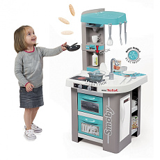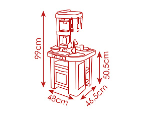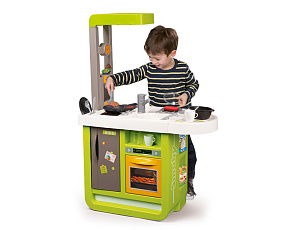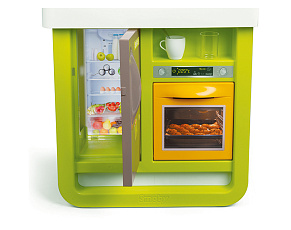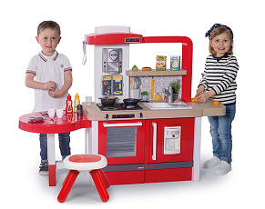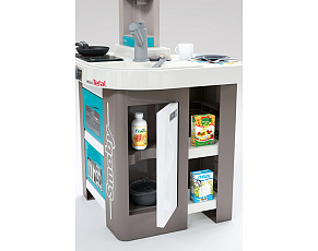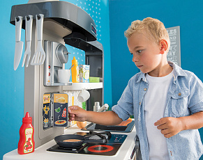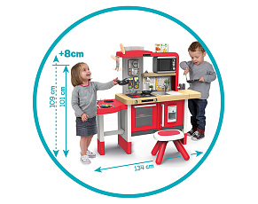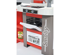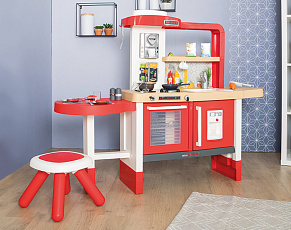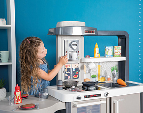 Размеры кухни «Смоби» адаптированы под рост среднестатистического дошкольника, ученика младших классов, а все миниатюрные бытовые приборы удобно держать в руках. Модель не занимает много места, поэтому она поместится даже в небольшой детской. В набор входит всё, что необходимо для приготовления пищи на настоящей кухне: полочки, ящики, мойка, плита с духовкой, игрушечные продукты, разделочный столик, посуда (кастрюли, тарелки, чашки и пр.). В электронных моделях в духовке даже есть подсветка, а конфорки издают реалистичные звуки приготовления еды (кипение воды, шипение сковородки). При этом все такие игрушки полностью безопасны, поскольку не выполняют настоящих функций (парить-жарить детки, конечно же, могут, но только понарошку).
