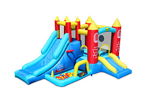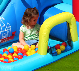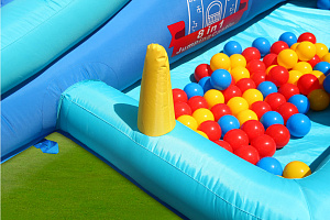 Детский спортивный комплекс в виде надувного батута-какое хорошее решение для активного отдыха ребятни! Здесь есть практически все – высокая горка, площадка для прыжков , отдельный уголок для малышей, которые любят побарахтаться в пластиковых шариках,2 кольца для игры в мяч, дартс. Можно собрать всех своих друзей и устроить командные соревнования-быстрее, выше, сильнее!