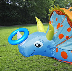 Надувная горка для купания может, как и прямая, иметь тормозную подушку в конце. Тогда с нее можно съезжать и без воды. Если же такой подушки нет, на ней рекомендуется играть как на водной.